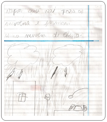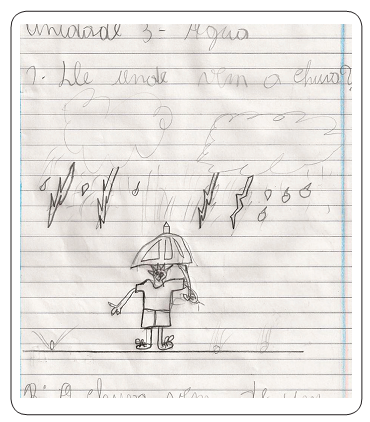 Na primeira produção Iago optou por desenhar duas nuvens com raios e gotas de água, que parecem representar uma forte chuva e um menino no centro do desenho segurando um guarda-chuva para não se molhar. Ao ser questionado sobre os raios, representados no desenho, sem ter sido feita qualquer referência no texto escrito, o aluno informou desconhecer sua origem, não arriscando nenhuma explicação para o fenômeno. Quando a pesquisadora solicitou mais informações sobre o seu desenho, Iago disse que não havia terminado sua atividade. No fim da conversa o aluno voltou a dizer à pesquisadora que completaria seu desenho. O aluno retornou com um desenho de duas nuvens, raios, um prédio (o aluno reside em um apartamento), dois postes e um automóvel, mas não achou necessário explicá-lo.