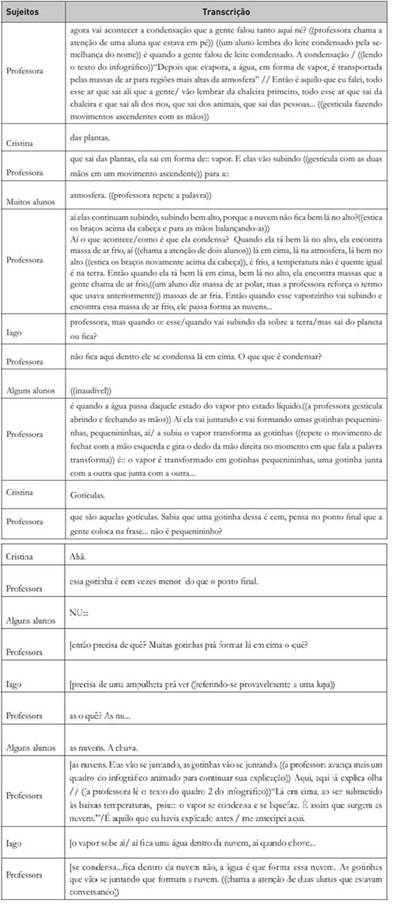 No exemplo a seguir, apresentamos um trecho das interações discursivas entre a professora e os alunos5 para exemplificar o modo como o infográfico animado foi explorado na aula. Selecionamos o trecho da aula em que se discute o processo de condensação da água por considerá-lo representativo da dinâmica desenvolvida pela professora. O trecho foi transcrito6 na íntegra com duração de 03 minutos e 21 segundos (08:06 - 11:27).