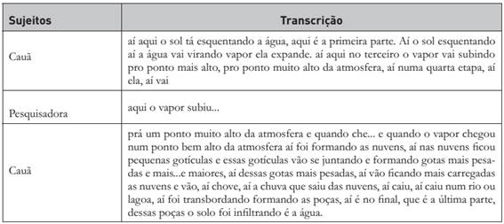 Na segunda produção de Cauã, texto verbal escrito e desenhos foram organizados em uma sequência numerada. Essa forma de organização do texto verbal escrito possibilitou uma coerência na apresentação das ideias sobre o ciclo. É possível verificar em sua escrita uma retomada dos conceitos da etapa anterior do ciclo seguida da apresentação de novas informações sobre o processo, além de uma evidente ampliação de repertório. As palavrasatmosfera, gotículas, poças, infiltra, ciclo, circulação da água, mencionadas no texto do infográfico e nas explicações da professora, foram expressas com propriedade nos textos verbais: oral e escrito do aluno. A seguir apresentamos um trecho da explicação de Cauã sobre sua produção para exemplificar como o aluno se apropriou das palavras alheias, incorporando-as ao seu discurso