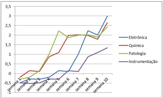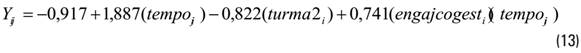Por essa equação, temos que a manutenção do engajamento cognitivo ao longo do curso (engajcogest) influenciou no ganho dos estudantes. Como a taxa evolutiva foi positiva (igual a 0,741), podemos dizer que os estudantes desse grupo apresentaram um ganho maior do que os estudantes dos outros grupos de engajamento cognitivo. Nessa equação, temos a variável dependente (ganho no entendimento- Yij) em função do tempo (tempoij), e podemos perceber que pertencer à turma 2 (estudantes que cursavam somente o ensino médio) influencia o ponto de partida, uma vez que essa parte da equação diz respeito ao intercepto da reta de regressão. Isso quer dizer que os alunos dessa turma apresentam um entendimento inicial significativamente menor que o restante da amostra, mas o fato de pertencer a essa turma não altera a evolução do entendimento em relação aos outros estudantes no decorrer da instrução.