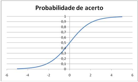 Onde e é igual à base do logaritmo natural (e = 2,7183...). É importante notar que quanto maior for a diferença entre a proficiência do sujeito e a dificuldade do item, maior será a probabilidade de acerto. Ou seja, quanto maior for habilidade do sujeito, por exemplo, e menor a dificuldade do item, maior a chance desse sujeito acertar. O gráfico abaixo representa a probabilidade de acerto de um item em função dessa diferença.