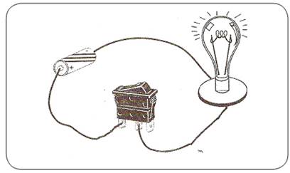 Uma ação cotidiana e corriqueira é apertar um interruptor e acender uma lâmpada, no teto ou no abajur. A figura 1 mostra um modelo mais simples dessa situação: uma pilha comum está ligada a um interruptor e a uma lâmpada de lanterna. Ao pressionar o interruptor, a lâmpada acende. Redija um texto explicando, de forma mais clara possível, tudo o que ocorre na pilha, fios, interruptor e na lâmpada quando ela está acesa.