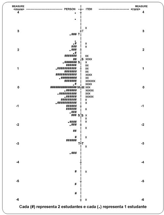 A figura 2 apresenta a régua resultante do tratamento Rasch para um conjunto de dados dicotômicos. A medida do entendimento dos estudantes (do modelo) é mostrada no lado esquerdo da figura, e a medida da dificuldade dos itens (corresponde à estimativa do parâmetro β) é mostrada no lado direito da figura. Cada x no lado direito da figura denota um item da escala. A marca M representa o valor médio da dificuldade dos itens e do entendimento dos estudantes, S indica que os parâmetros estão deslocados da média em um desvio padrão e T indica que os parâmetros estão deslocados da média em dois desvios padrão. A escala apresenta um intervalo que vai de -6 logits a 4 logits.