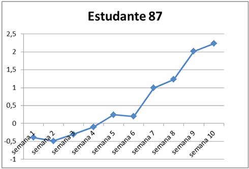 A partir da análise exploratória, Coelho (2011) reconheceu que o preditor engajamento cognitivo deveria ser inserido nos modelos a serem testados na regressão multinível. Diferentes modelos foram testados e foi verificado que o fato de os estudantes pertencerem a uma turma específica e mantiverem o engajamento cognitivo ao longo do curso influenciou na aprendizagem sobre circuitos elétricos. Além de verificar quais são esses fatores, a análise fornece o modelo que melhor explica como eles influenciam o ganho (ou evolução) no entendimento, ou seja, especificam a taxa de evolução (representado pelo valor da inclinação da regressão) referente a cada um dos preditores. No nosso caso, o modelo que melhor descreveu a aprendizagem sobre circuito elétrico pode ser descrito pela equação: