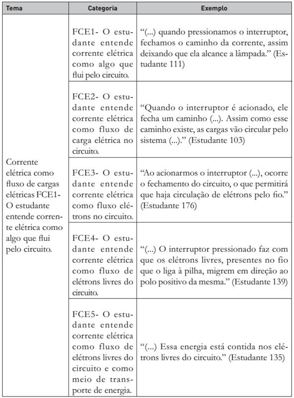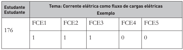 Nesse caso, o estudante 176 apresenta a descrição para corrente elétrica como fluxo de cargas da seguinte maneira: "Ao acionarmos o interruptor [...] ocorre o fechamento do circuito, o que permitirá que haja circulação de elétrons pelo fio". A resposta foi classificada como categoria FCE3, ou seja, no terceiro nível de complexidade. A construção dos itens dicotômicos consiste em atribuir o valor 1 para a categoria de maior complexidade alcançada pelo aluno e também para todas as categorias precedentes. Para todas as outras categorias mais altas não atingidas, o valor 0 é atribuído (FCE4 e FCE5).
