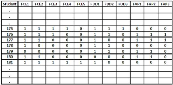 Feito isso para todos os temas e para todos os níveis de cada tema, temos uma matriz de resposta dicotômica, que podemos vislumbrar a partir do recorte feito na Tabela 2, dos alunos 175 a 181.