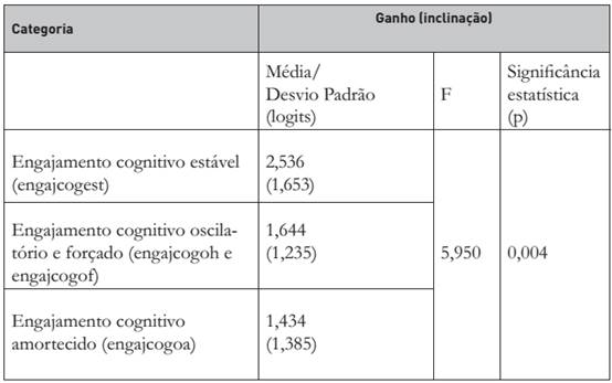 O indicador de engajamento cognitivo foi definido a partir das trajetórias individuais dos estudantes, tomando como base o escore bruto desses estudantes nos testes aplicados durante a intervenção educacional de eletricidade. Três diferentes grupos foram identificados: (1) o primeiro grupo agrupava os estudantes que mantiveram a estabilidade no engajamento cognitivo (engajcogest); (2) o segundo grupo aglutinaria as categorias com os estudantes que apresentaram instabilidade durante todo o curso ou aumentaram a instabilidade ao final das aulas (categorias engajcogoh e engajcogof); (3) o terceiro grupo corresponderia à categoria na qual os estudantes aumentaram a estabilidade em relação ao engajamento cognitivo ao final do curso (engajcogoa). Os resultados da Tabela 03 indicam que existem diferenças em relação ao ganho dos grupos (F(2,83)= 5,950; p=0,004) sendo que o maior ganho foi do grupo constituído pelos estudantes que apresentaram engajamento estável (α1 =2,536; SD=1,653).