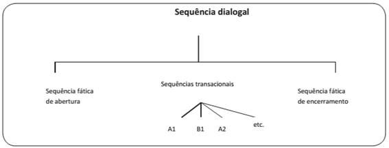 A sequência dialogal se distingue pela alternância de turnos entre dois ou mais interlocutores (A, B, etc.). Tal sequência é praticamente um procedimento composicional do discurso didático, em que o professor pode fazer convite à argumentação e, também, manter a dinâmica estabelecida. O professor, por meio do diálogo, orienta a criação de uma temporalidade nas proposições, retomando argumentos, fortalecendo evidências e utilizando marcadores linguísticos. O professor pode, ainda, eleger um interlocutor privilegiado para essa alternância ou mesmo, em sua fala, alternar posicionamentos discursivos. As sequências fáticas, tanto de abertura como de fechamento, mostradas na figura 3, simbolizam rituais culturais que iniciam ou concluem a interação entre os interlocutores. Já as sequências transacionais revelam o propósito do ato comunicativo.