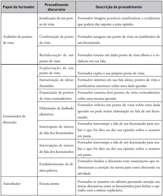 Levando em conta essa discussão, a literatura que consultamos (WERLICH, 1976; ADAM, 1992; BRONCKART, 1999; ADAM, 2008) e os resultados de pesquisas anteriores (VIEIRA; NASCIMENTO, 2009; VIEIRA; KELLY; NASCIMENTO, 2012; VIEIRA; NASCIMENTO, 2013), afirmamos que cada orientação discursiva abre espaço para a emergência de um conjunto de PDD que se articulam de acordo com os papéis particulares que o professor assume. No quadro 1, apresentamos uma síntese dos PDD de um professor formador ao agir em dois episódios argumentativos de sala de aula específica do ensino superior. Para o caso do primeiro episódio, o professor formador abre a sequência argumentativa apresentando dois pontos de vista contraditórios e suas respectivas justificativas. Na sequência, ele se utiliza de vários procedimentos para gerir e, finalmente, fechar esse episódio argumentativo (que teve fases bem delimitadas de começo, meio e fim e foco temático bem estabelecido). Nesse processo, o formador assume os papéis tanto de participante quanto de gerenciador da discussão, visando fomentar os argumentos válidos e confrontar as contradições. Esse exercício analítico aponta um mapeamento dos PDD em um fluxo discursivo argumentativo de sala de aula (uma orientação discursiva argumentativa), atualizado por procedimentos discursivos dos sujeitos em interação e que responde a um objetivo didático claro do professor: gerir oportunidades de aprendizado. Essa é uma síntese de exercício de análise por meio da tríade discursiva "orientação discursiva, objetivos didáticos, PDD".