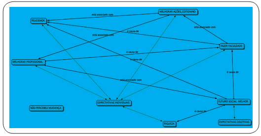 Nessa última subcategoria percebe-se representações sociais dos alunos da EJA que parecem ser as mesmas de grande parte da sociedade em relação ao Ensino Superior. A representação fica perceptível quando se analisam as respostas ao questionário, o "fazer faculdade" aparece como única expectativa para uma boa parte dos alunos da EJA. É como se o simples fato de ingressar na universidade fosse uma "porta" para o sucesso financeiro e pessoal, trazendo dinheiro, prosperidade e felicidade. Esse fato fica claro nas falas a seguir: "fazer a minha faculdade de serviço social" (P2) e "passar no Enem e fazer uma faculdade de assistente social" (P23).