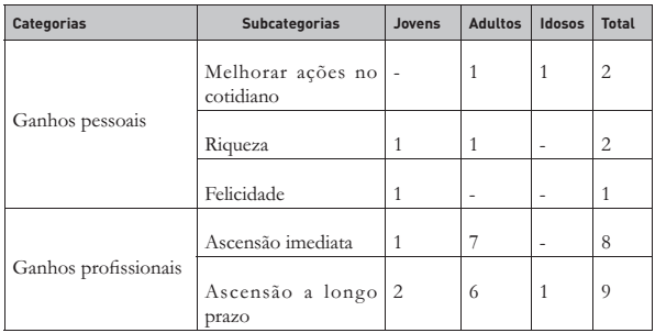 No âmbito da macrocategoria "expectativas individuais", foram identificadas duas categorias: ganhos profissionais e ganhos pessoais (Tabela 1). Analisando as respostas dadas, percebe-se que, independentemente da faixa etária, para a maioria dos respondentes, as expectativas estão relacionadas ao ganho profissional.
