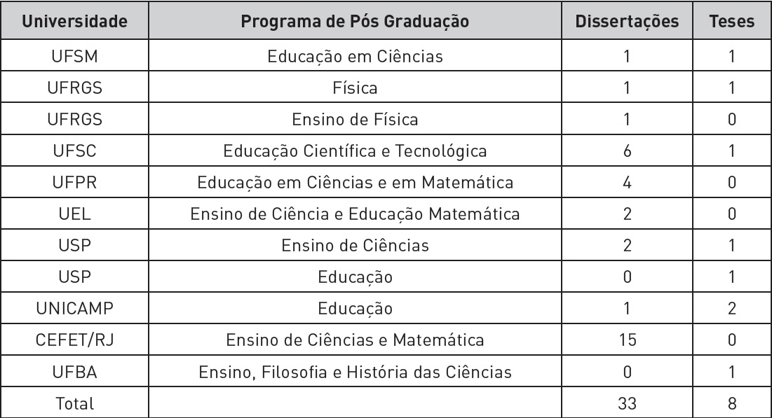 Foram selecionados 41 trabalhos de 11 programas de pós-graduação, sendo 33 dissertações de mestrado e oito teses de doutorado. A relação das universidades, programas de pós-graduação e a quantidade de trabalhos analisados em cada instituição são apresentados na Tabela 1. Os títulos dos estudos encontram-se no Anexo 1. As teses de doutorado são identificadas por D1 a D8, e as dissertações de mestrado por M1 a M33.