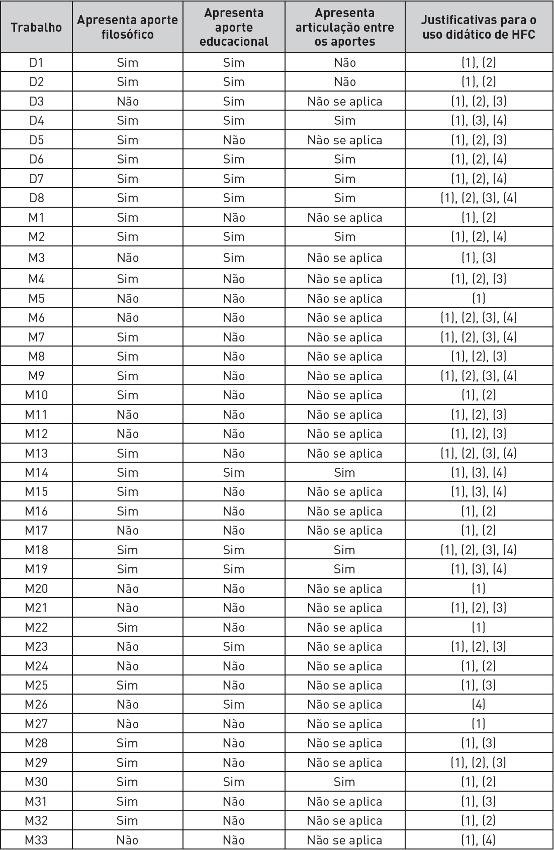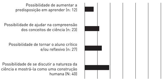 Por vezes, alguns autores recorrem a mais de uma categoria, por isso o número total de citações é maior do que o número total de trabalhos analisados. A mais frequente foi (1) à possibilidade de se discutir a natureza da ciência e mostrá-la como uma construção humana; quarenta estudos usaram tal justificativa. A segunda mais comum foi (2) a de tornar o aluno crítico e/ou reflexivo, citada por 27 trabalhos, seguida por (3) ajudar na compreensão dos conceitos de ciência, mencionada por 23 investigações. O quarto padrão de justificação mais recorrente foi (4) à possibilidade de desconstrução da visão de ciência como um assunto difícil e assim poder aumentar a predisposição em aprender esta área, por doze trabalhos.