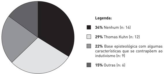 Dentre as pesquisas analisadas, quatorze, cerca de 34%, não declararam seu aporte filosófico ao defenderem o uso didático da história e filosofia da ciência. Thomas Kuhn foi o filósofo mais usado como referência, em cerca de 29% dos trabalhos. Aproximadamente 22% dos autores alinharam-se às críticas de vários filósofos da ciência a visão empírico-indutivista. Outras visões filosóficas utilizadas foram as de Paul Feyerabend, Stephen Toulmin, Gaston Bachelard, Bruno Latour e Imre Lakatos.