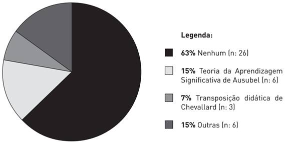 Em relação à filiação educacional, 26 (63%) não declararam qual teoria de aprendizagem orientou o desenvolvimento da pesquisa. As teorias mais citadas foram as da aprendizagem significativa de Ausubel e da transposição didática de Chevallard (7% e 5%, respectivamente). Também foram mencionadas a perspectiva sociointeracionista de Vigostski, a de Paulo Freire, a transposição didática de Gagliard e Astolfi, a teoria educacional de Bob Gowin e a Teoria da Aprendizagem Significativa Crítica de Moreira.