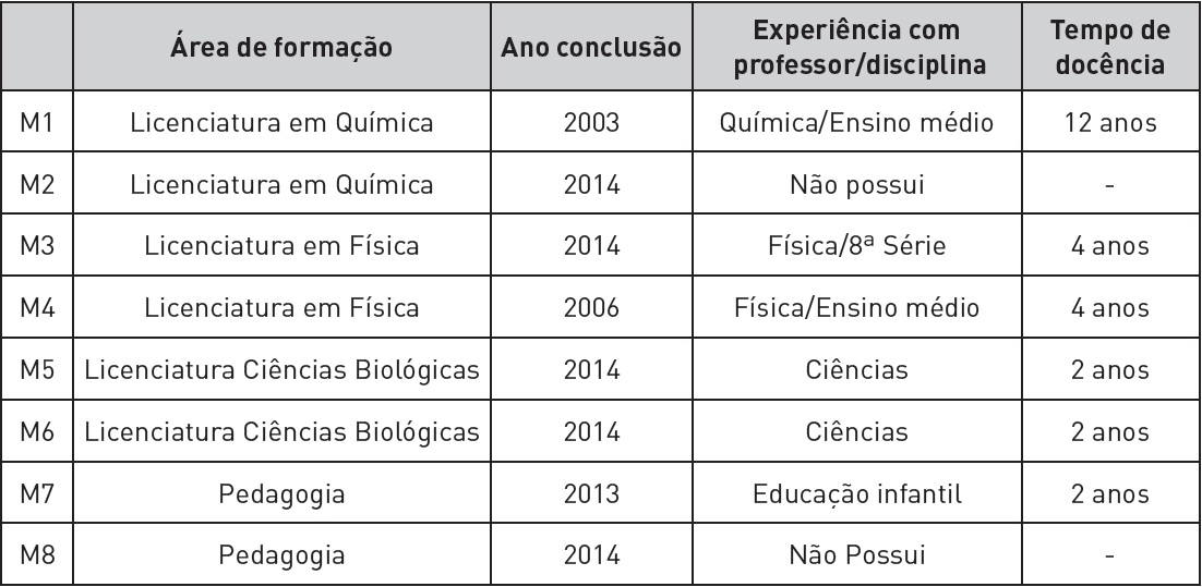 Esta pesquisa foi realizada com oito estudantes regularmente matriculados em um curso de Mestrado Acadêmico em Educação em Ciências oferecido por uma universidade pública, no estado da Bahia. Os mestrandos são licenciados em Ciências Biológicas, Física, Química e Pedagogia, sendo dois alunos pertencentes a cada uma das áreas do conhecimento. No Quadro 1, são apresentadas informações referentes à formação e atuação de cada um dos participantes.