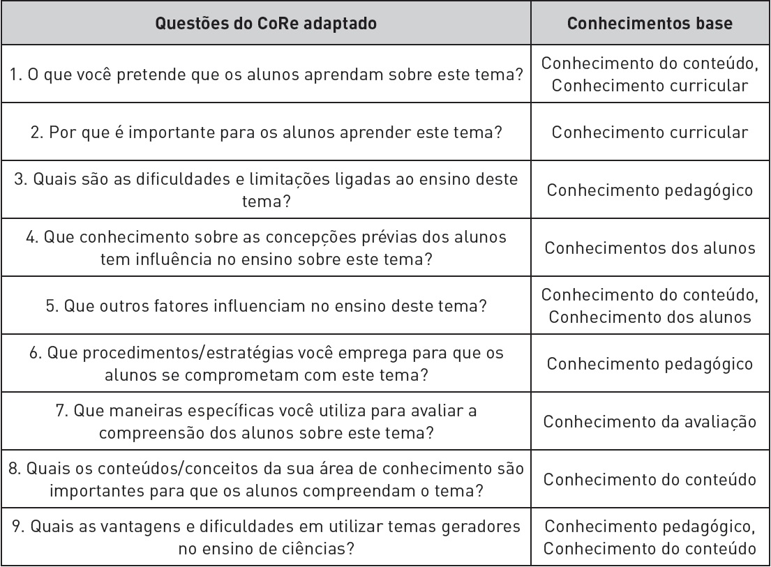 No Quadro 2, a seguir, propomos uma relação entre as questões do CoRe adaptado e os conhecimentos base para profissão docente, propostos pela Cúpula do PCK e empregado como referencial teórico neste estudo.