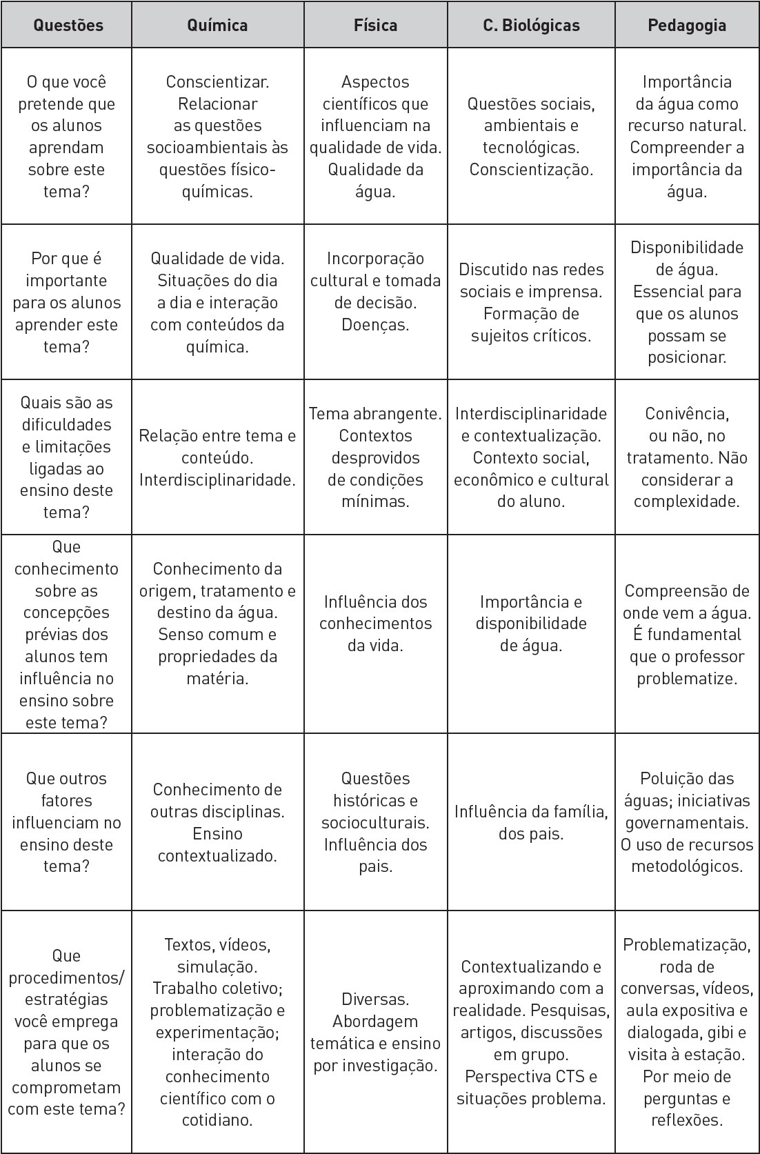 A valorização das concepções prévias dos alunos, como eles aprendem, suas habilidades e interesses são importantes elementos do PCK do professor (ROLLNICK et al., 2008), uma vez que podem ser usados para dar mais significado ao ensino. Nas atividades de EA, é imprescindível a participação dos alunos, pois normalmente implica a busca de informações acerca do contexto no qual estão inseridos, troca de ideias, discussão e tomada de decisões. De maneira geral, os participantes dessa pesquisa consideram importante o conhecimento das concepções prévias dos alunos no ensino do tema água, no que concerne à sua origem, tratamento e destino, assim como dos conhecimentos oriundos do senso comum e da vida.