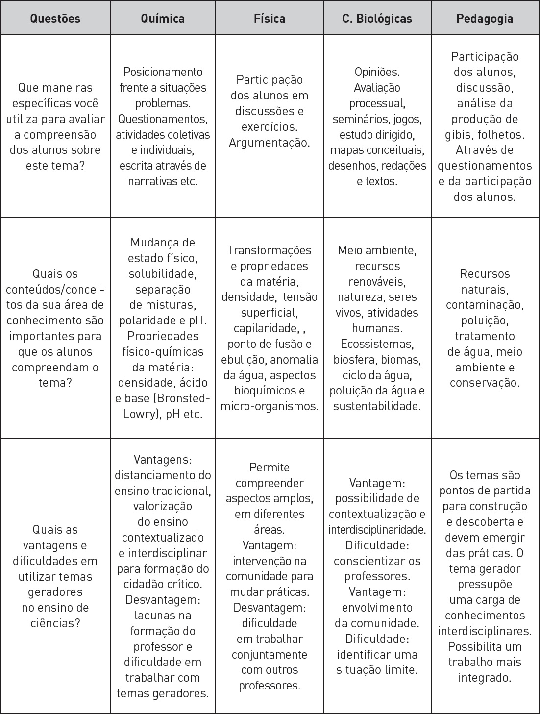 O Quadro 5, a seguir, apresenta uma síntese das respostas dos mestrandos para as questões do CoRe relacionadas à avaliação, aos conteúdos da área específica de conhecimento e às concepções dos participantes sobre as vantagens e dificuldades para a utilização dos temas geradores na sala de aula.