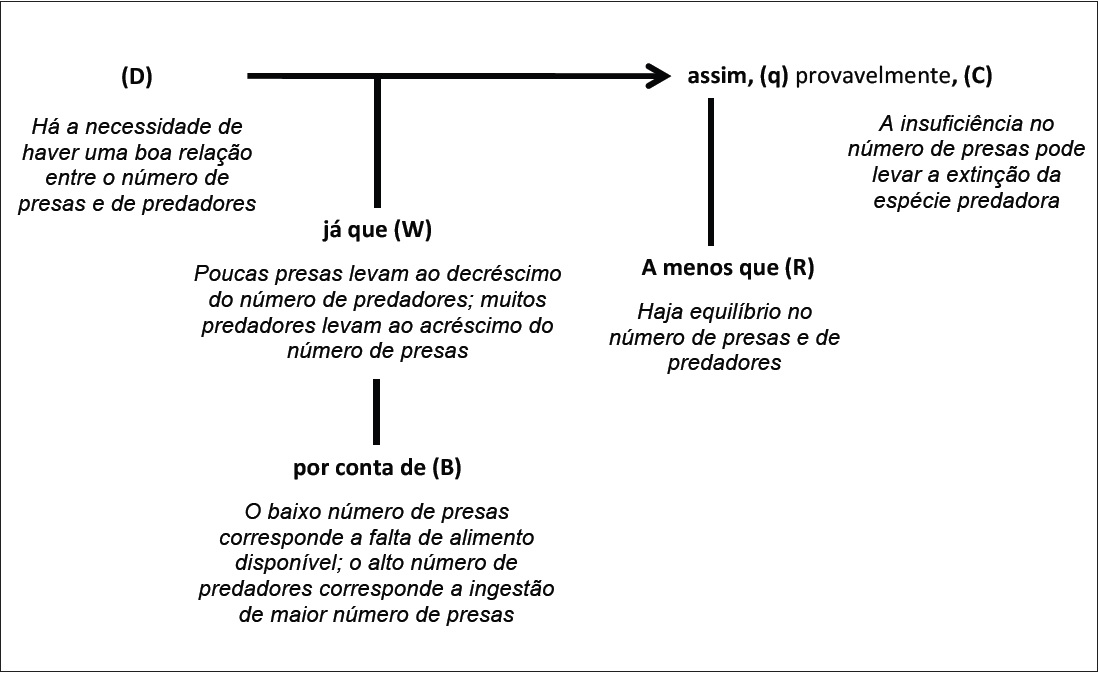 As perguntas feitas pela professora sobre a flutuação na população de presas e predadores exigem que os alunos desenvolvam raciocínios sobre os dados que têm disponíveis. A fala de Luciano (turnos 97 e 103) descreve corretamente a relação de causa e efeito ocasionada pela variação das populações representadas na tabela e responde o que fora solicitado pela professora em seus questionamentos. Notemos que a fala de Luciano pode, também, ser associada à garantia (W) e ao apoio (B) do argumento de referência elaborado anteriormente (figura 1), pois ele correlaciona as variáveis de tal forma que possibilita a criação de vínculo entre os dados (D) e a conclusão (C).