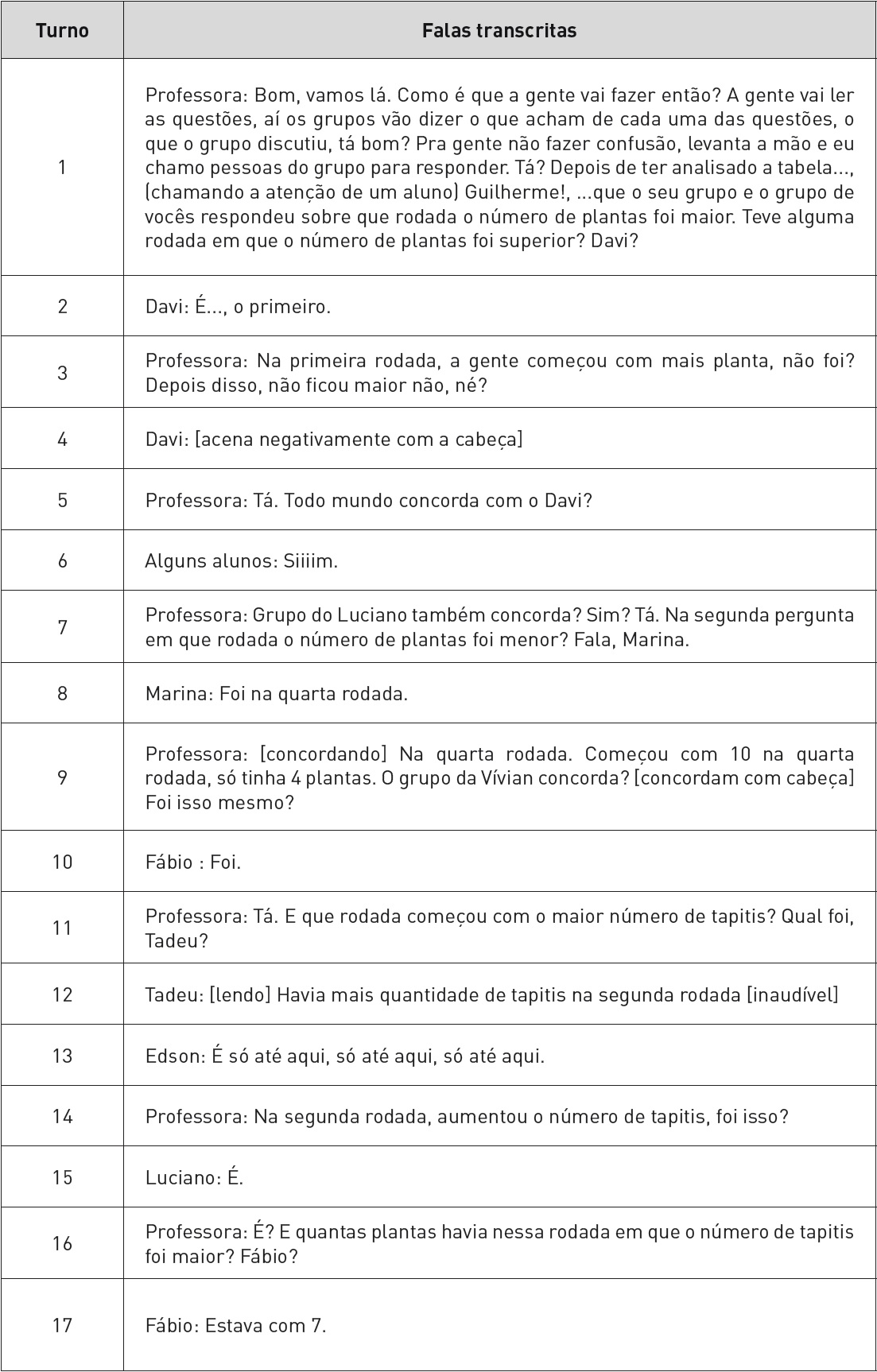 As principais perguntas feitas pela professora foram “em qual rodada há o maior número de plantas?” (turno 1), “em que rodada o número de plantas foi menor?” (turno 7), “que rodada começou com o maior número de tapitis?” (turno 11). Todas essas perguntas direcionavam a atenção dos alunos aos dados disponíveis que, conforme eram mencionados promoviam a interação com o material que possuíam em mãos.