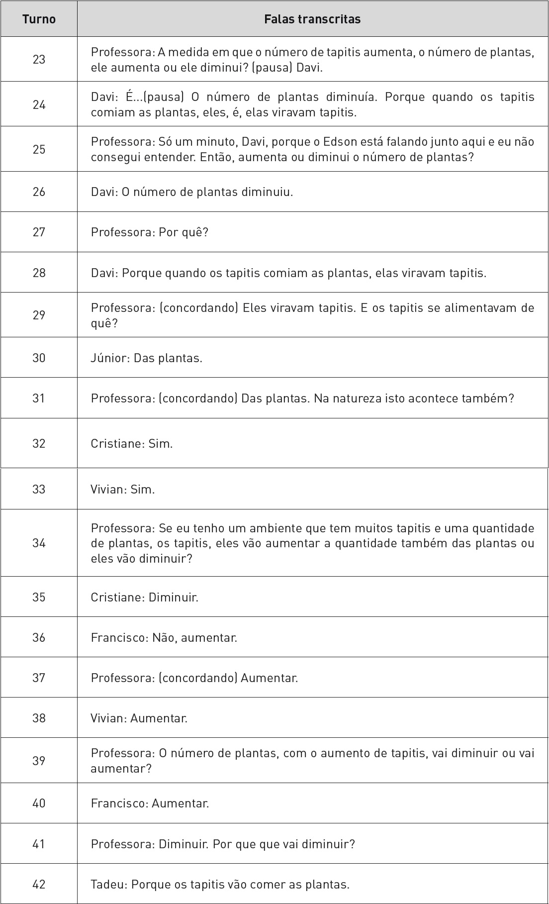 Nos turnos seguintes a professora continua a realizar perguntas aos alunos, mas com naturezas distintas das que foram feitas no primeiro momento em que a exigência era apenas a leitura dos dados da tabela. No turno 23, por exemplo, é possível perceber que a professora emite uma pergunta que marca a busca pela criação de relação entre as variáveis do problema: população de plantas e população de tapitis.