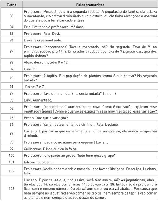 Este primeiro trecho da aula é marcado pela leitura dos resultados descritos na tabela que os alunos tinham em mãos, construída durante a atividade “Presa e Predador”. O intuito da professora foi evidenciar os dados importantes à construção de entendimento da situação pelos alunos. Nesse sentido, foram emitidas perguntas que exigiam, essencialmente, a leitura atenta do material disponível, favorecendo a interação dos alunos com os dados, os recursos e outras informações.