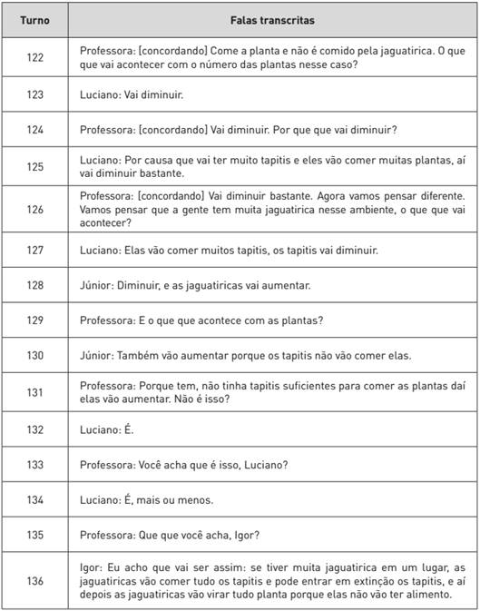 Feita a organização dos dados e a relação entre a variação da flutuação das diferentes espécies envolvidas no jogo, a professora continua o curso da investigação analisando conjuntamente com os alunos as situações limites em que as explicações construídas são válidas. Essa conclusão pode ser percebida na leitura das perguntas feitas pela professora nos turnos 126 (“Vamos pensar que a gente tem muita jaguatirica nesse ambiente, o que que vai acontecer?”) e 129 (“E o que que acontece com as plantas?”). As respostas emitidas por Luciano (turno 127) e Junior (turnos 128 e 130) a essas perguntas possibilita que a professora aprofunde a discussão favorecendo a participação dos demais colegas. Finalmente, Igor, que tem sua participação requisitada pela professora, organiza e sintetiza as contribuições dos colegas (turno 136), colocando na discussão a conclusão (C) do argumento que se almeja construir com a investigação feita durante a aula. Em outras palavras, podemos descrever que a fala de Igor pode ser entendida como “a insuficiência no número de presas pode levar a extinção da espécie predadora”, tal qual descrito anteriormente.