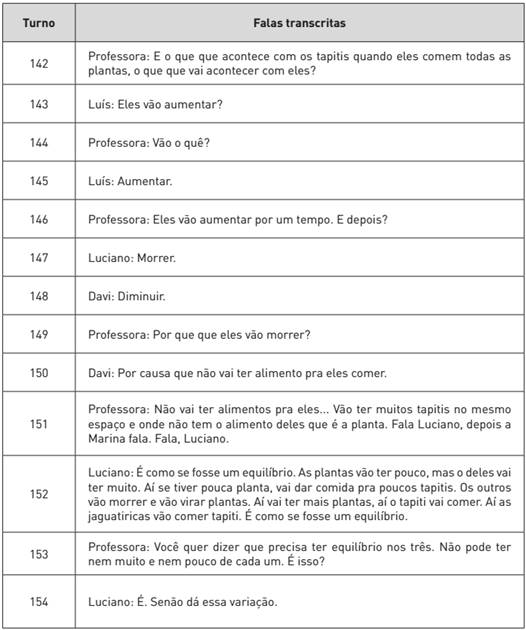No turno 152, Luciano também sintetiza as contribuições trazidas pelos seus colegas durante as interações promovidas pela professora. Quando destaca a questão da necessidade de equilíbrio entre as populações das espécies, podemos enquadrar sua fala como sendo o refutador (R) descrito anteriormente.