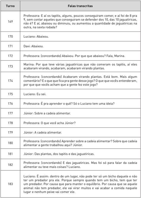 A colaboração entre os alunos e a importância da promoção de interações pela professora fica ainda mais evidente quando analisamos os turnos finais da aula expressos no quadro 6. A partir do turno 169, vemos que a participação dos alunos Davi e Luciano é mais recorrente. Entretanto, a professora é cuidadosa em solicitar a participação de outros alunos, como no caso da aluna Marina (turno 172 e do aluno Júnior (turno 178 e 180).