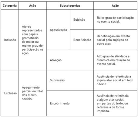 As operações linguísticas ligadas à categoria inclusão dos atores sociais, por ativação ou apassivação, podem ser: referência explícita ao ator social e identificação dos verbos, adjetivos e pronomes relacionados ao ator social.