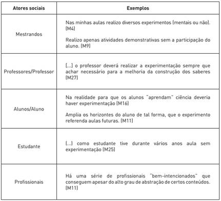 Portanto, nos três casos em que o ator social “professor” foi mencionado identificamos diferentes nuances de sua representação no discurso, tais como: aquele que realiza a experimentação em alguma situação; aquele que não precisa realizar o experimento para ensinar e aquele que não realiza o experimento e prejudica a aprendizagem do aluno.
