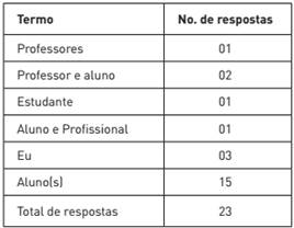 Identificou-se maior referência ao(s) ator(es) social(ais) aluno(s), somando 18 respostas (“Aluno e Profissional” (01), “Aluno e Professor” (02) e “Alunos(s) (15)) e 30 ocorrências distribuídas entre estas respostas. Diferente disso, o termo professor ocorreu duas vezes, o termo professores uma vez, e os termos profissional e estudante ocorreram, cada um deles, uma vez.