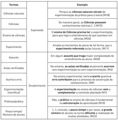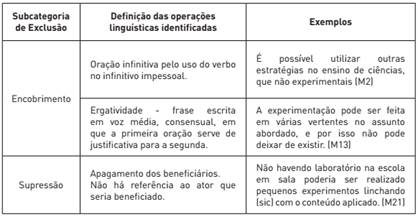 Temos a supressão do ator social quando não há referência identificada do(s) ator(es) da prática em questão em nenhuma parte do texto. Uma forma de exclusão parcial é o encobrimento, no qual o ator é relegado a um segundo plano, ou seja, as referências aparecem de modo sutil. Nos casos de exclusão por encobrimento, é possível recuperar o “ator social” envolvido na prática, por exemplo, a frase “Não, a prática no ensino de ciências é fundamental na estruturação do aprendizado (M10)”, quem é responsável pela prática e pela estruturação do ensino, no contexto escolar, é o professor.