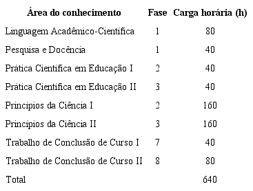 Enfatiza-se que a Licenciatura em Física apresenta um diferencial diante desse cenário e desenvolve a pesquisa e a metodologia científica em diversas disciplinas ao longo do curso. Essas disciplinas totalizam 640 horas de carga horária (Tabela 1) e representam aproximadamente 20% da carga horária total do curso. Na primeira fase da licenciatura, duas disciplinas desenvolvem conteúdos relacionados à metodologia científica: Linguagem Acadêmico-Científica e Pesquisa e Docência. Em Linguagem Acadêmico-Científica, são desenvolvidas estratégias de escrita e formatação de trabalhos acadêmicos e, em Pesquisa e Docência, os tipos de pesquisa na educação e a pesquisa em sala de aula. Na segunda fase do curso, as disciplinas Prática Científica em Educação I e Princípios da Ciência I têm o objetivo de desenvolver a metodologia científica, mas de formas distintas: em Prática Científica em Educação I, é elaborado um projeto de pesquisa com enfoque na reflexão sobre o contexto escolar e, em Princípios da Ciência I, a pesquisa é utilizada como metodologia de ensino, como articuladora de conhecimentos específicos e pedagógicos. Na terceira fase, encontram-se as disciplinas Prática Científica em Educação II e Princípios da Ciência II; em Prática Científica em Educação II, é realizada a coleta de dados e o artigo final da pesquisa. Por fim, na sétima fase do curso, é feito o Trabalho de Conclusão de Curso I e, na oitava fase, Trabalho de Conclusão de Curso II. Em Trabalho de Conclusão de Curso I, o licenciando apresenta o projeto da pesquisa, enquanto em Trabalho de Conclusão de Curso II, é realizada a coleta de dados, a escrita da pesquisa e a defesa em banca examinadora.