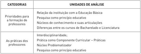 Na análise de dados, foram seguidos os passos para a análise de conteúdo sugeridos por Triviños (1987), Bardin (1999) e Lüdke e André (1986). No primeiro passo, chamado pré-análise, foi feita uma primeira leitura dos documentos para visualizar seu conjunto e extrair particularidades para uma primeira categorização e classificação. O quadro 1 exemplifica as categorias de análise e suas unidades.
