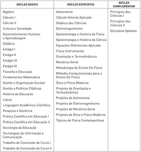 Os núcleos problematizadores, como já apresentado, desenvolvem as diversas relações, promovendo a articulação da instituição com a educação básica pela pesquisa e entre os conhecimentos específicos e pedagógicos. As unidades curriculares Princípios da Ciência I e II desenvolvem a articulação de conhecimentos por meio de estratégias de prática como componente curricular. As disciplinas Projetos de Gravitação e Termodinâmica, Projetos de Astronomia, Projetos de Eletromagnetismo, Projetos de Mecânica Geral, Projetos de Ótica e Física Moderna também são consideradas articuladoras, pois, da mesma forma que Princípios da Ciência I e II, estabelecem formas de desenvolver os conteúdos de física por intermédio de experimentos, realizando ao mesmo tempo, com o licenciando, estratégias de ensino que articulam os conhecimentos de física e os conhecimentos pedagógicos.