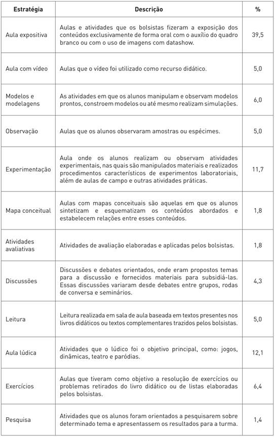 Para abordar os conteúdos indicados no Quadro 1 os bolsistas ID utilizaram diversas estratégias de ensino, num total de 281. Essas estratégias foram agrupadas em 13 categorias, as quais são descritas no Quadro 2.