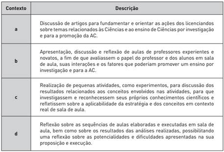 Os quatro contextos não são promovidos necessariamente nesta ordem, mas se comunicam durante todo o PRO, podendo proporcionar situações para que os futuros professores coloquem em ação as suas concepções, os seus conhecimentos sobre o conteúdo e sobre os saberes integradores e pedagógicos, os seus dilemas sobre a prática e a teoria, bem como, a relação entre essas duas esferas do saber.