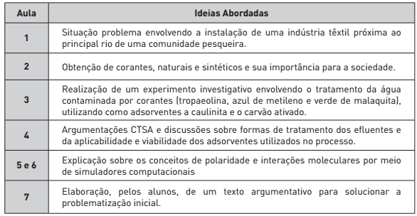 Uma semana após a proposição do último plano, o licenciando inicia a regência da sequência de sete aulas na escola parceira. Os principais aspectos abordados nas sete aulas estão descritos no Quadro 12.