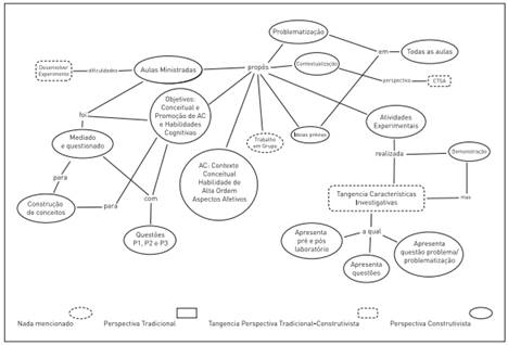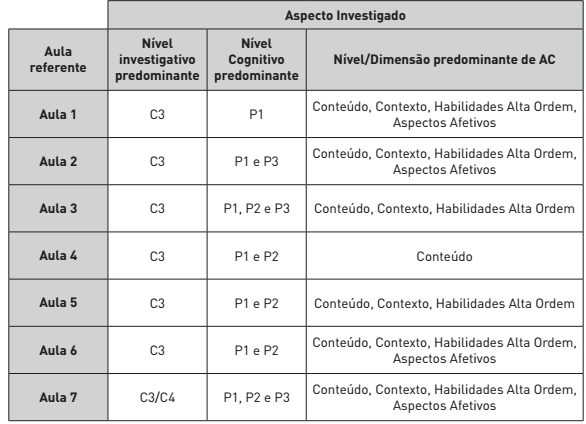 A Figura 3 mostra que as aulas ministradas pelo licenciando R apresentaram características norteadoras deste PRO. As aulas contemplaram elementos pedagógicos de um ensino por investigação, como a problematização e ainda o desenvolvimento de habilidades relacionadas às quatro dimensões de AC, ou seja, Conceitual, Contexto, Habilidades de Alta Ordem e Aspectos Afetivos.