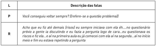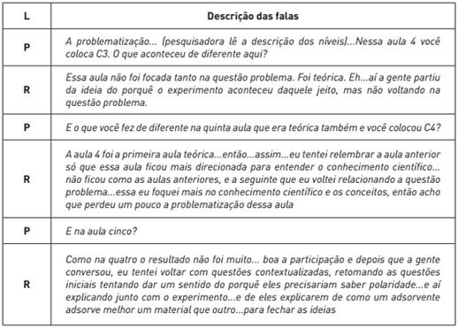 Ao analisar as gravações das aulas, licenciando e pesquisadora observam que em todas as aulas ministradas por ele, foram retomadas discussões acerca da situação problema. Estes momentos são fundamentais no ensino baseado em uma perspectiva por investigação, uma vez que propicia ao aluno refletir e criticar o contexto da situação, possibilitando-o a coletar e comparar dados, elaborar hipóteses e propor inferências para responder ao problema.