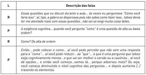 É importante destacar que concordamos que um ensino baseado nesta perspectiva precisa ser desenvolvido de forma dialogada, por meio de questões de diferentes exigências cognitivas. Para isso, os licenciados também tiveram acesso a discussões e reflexões sobre a relação entre o nível de exigência cognitiva das questões propostas pelos professores e das habilidades cognitivas manifestadas pelos alunos.