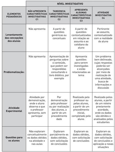 - Nível Investigativo das sequências de aulas elaboradas e das aulas ministradas: O Quadro 2 mostra os elementos pedagógicos considerados essenciais para uma atividade ser considerada investigativa e a característica de cada um dos elementos segundo o nível de investigação (SILVA, 2011).1