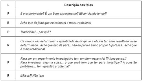 Por exemplo, o experimento proposto pelo licenciando se referia à determinação de oxigênio dissolvido na água, com o objetivo de tratar conceitos como reação química, cálculo estequiométrico e oxirredução, por meio da análise quantitativa da massa de O2 presente em uma palha de aço imersa em uma amostra de água. Mas, a descrição do experimento apresentada por R se limitava a aspectos conceituais, não destacando habilidades que poderiam ser desenvolvidas pelo envolvimento ativo dos alunos na realização da atividade. O licenciando não apresentou uma questão problema, questões para serem respondidas pelos alunos ou um objetivo para a atividade. Assim, ao não propor o desenvolvimento de habilidades cognitivas ou relacionadas à investigação, o experimento poderia apenas apresentar características de uma atividade para verificação de conceitos. Alguns desses aspectos são discutidos durante o encontro individual reflexivo, evidenciados no Quadro 5 a seguir. Por meio da mediação da pesquisadora (P), a ausência da questão problema é percebida pelo licenciando e ele reconhece que sua proposta ainda apresenta lacunas para ser considerada uma atividade por investigação.