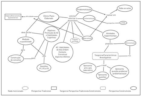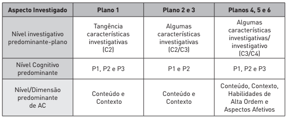 No entanto, conforme os planos vão sendo lapidados, ou seja, no momento em que o licenciando consegue definir seus objetivos, conteúdos, questões e atividade experimental, a sequência apresenta-se mais estruturada e organizada, podendo assim, contribuir para a evolução no nível investigativo, desenvolvimento cognitivo e da AC em dimensões mais elevadas, contemplando, inclusive, as quatro dimensões.