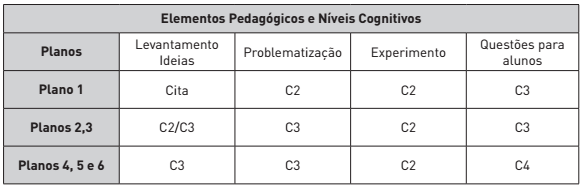 Essas pequenas, mas constantes alterações nos planos do licenciando R, mostram sua preocupação e sua inquietação ao elaborar uma sequência que motivasse e instigasse os alunos durante todas as aulas, o que contribuiu, também, para uma evolução nos níveis de AC. O plano 1, por exemplo apresentava competências das dimensões Conteúdo e Contexto, pois o licenciando valorizou demasiadamente o desenvolvimento de conceitos e apresentou limitação na descrição de atividades, como o levantamento de ideias prévias e de elementos relacionados à uma atividade experimental investigativa. Assim, mesmo apresentando algumas questões de alta ordem cognitiva, a limitação no desenvolvimento dos elementos pedagógicos com características investigativas poderia prejudicar o desenvolvimento conceitual e cognitivo dos alunos.