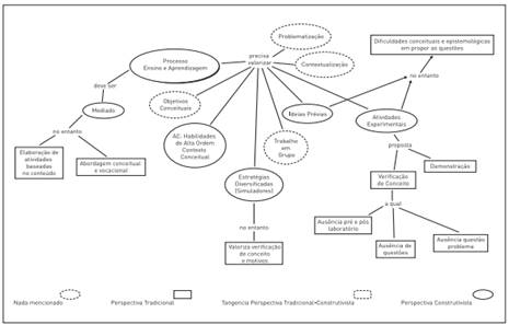 Conforme apresentado na metodologia, ao iniciar o PRO o licenciando R participou da elaboração de algumas atividades que possibilitaram a ele refletir sobre suas concepções, bem como, à pesquisadora, reconhecê-las. A Figura 1 representa as ideias manifestadas por ele durante sua participação nessas atividades, bem como, a relação dessas ideias com a perspectiva norteadora deste PRO, ou seja, um processo de ensino visando a alfabetização científica por meio do ensino por investigação.