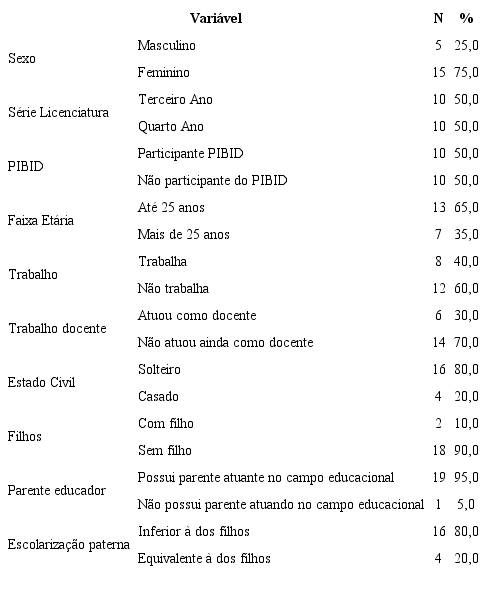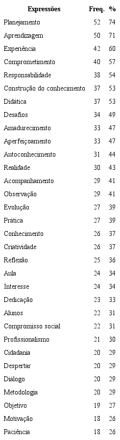 Após processadas as informações do questionário foram elencadas as 32 expressões mais frequentes para as triagens sucessivas utilizadas nas entrevistas semiestruturadas. Ao todo, participaram da pesquisa 90 informantes dos terceiros e quartos anos das licenciaturas; 70 alunos responderam ao questionário e 20 participaram da entrevista. Responderam ao questionário 24 alunos do 3º ano da licenciatura de Geografia, 21 alunos do 3º ano e 25 alunos do 4º ano da licenciatura de Matemática; e foram entrevistados dez alunos do 3º ano e dez alunos do 4º ano, participantes ou não participantes do PIBID, na proporção 1:1 da Licenciatura de Ciências Biológicas. Priorizou-se a escolha dos informantes das Ciências Biológicas para o aprofundamento das informações na entrevista por ser esse o espaço de inserção dos pesquisadores.