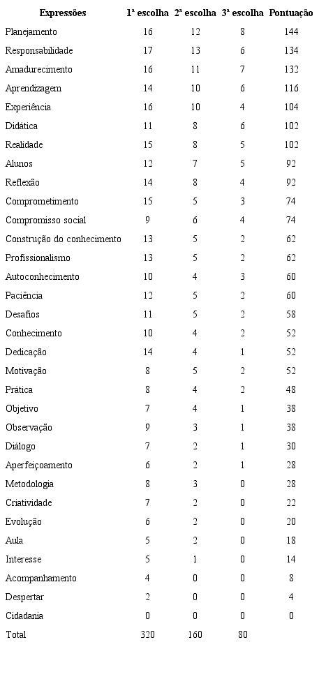 Na entrevista os sujeitos discorreram sobre as quatro expressões selecionadas nas triagens sucessivas sobre o ECS. Quando essas 32 palavras foram apresentadas aos acadêmicos do curso de Licenciatura em Ciências Biológicas na triagem hierárquica sucessiva, obtivemos a pontuação mostrada na tabela 3. As 11 palavras mais citadas são equivalentes às da tabela 3.
